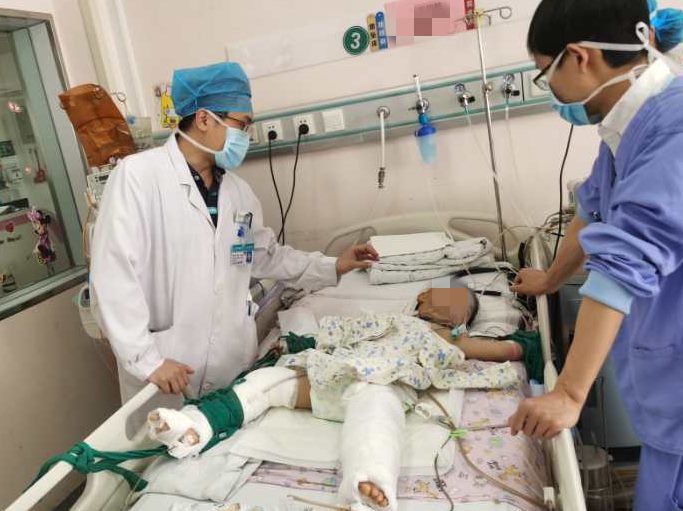 主治医师李昱缓慢打开小雨被包裹得严严实实的双下肢后,大家发现,小雨自左侧骨盆向大腿前内侧的皮肤已不知踪影,撕裂破损的肌肉里可以看到左侧股骨的远端骨折端外露,畸形严重,右小腿的皮肤完全脱套至右侧足底,皮肉分离严重,大面积创面还在往外渗出鲜血,浸透了覆盖着创面的纱垫。