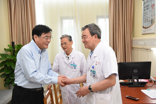 在对80岁以上返聘党员专家代表朱钵、马厚志、马桂英、顾以茼、银平章等进行慰问时,院领导感谢他们虽已退休多年,但仍默默地坚守在临床一线,为医院、为科室发展积极工作,释放着自己的光和热,用实际行动践行着共产党人的誓言。7月4日,恰逢是入党50年以上老党员、十大功臣、原大外科主任李永槐百岁生日,党委书记邵凤民、党委副书记兼工会主席武素英、副院长孙培春代表院党委专程到病房为老人祝贺生日,祝愿老人早日康复。